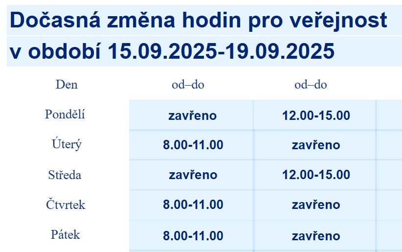 v týdnu 15.-19.9.2025: po, st: 12.00 - 15.00, út, čt, pá: 8.00 - 11.00 hodin.