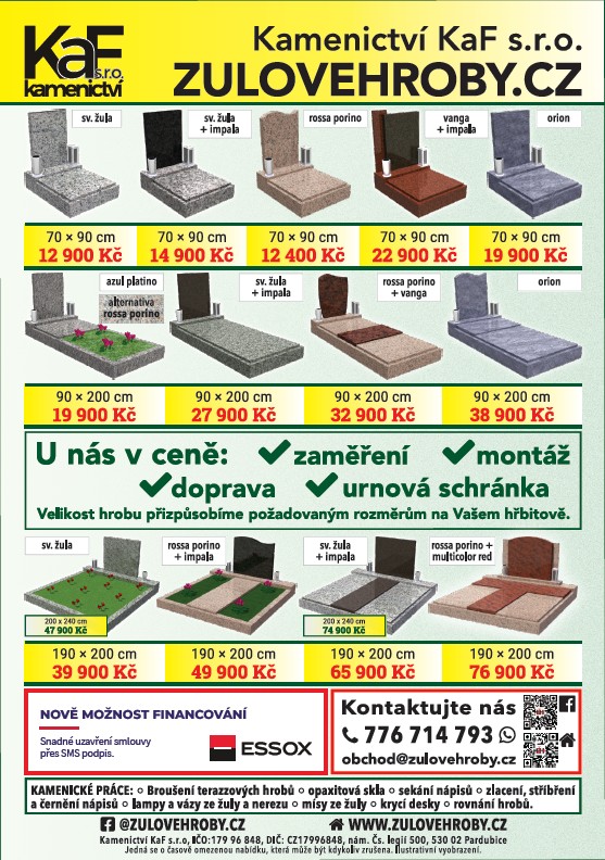 V úterý 14. 4. a 21. 4. v 09:00 – 09:20 bude na hřbitově v Luštěnicích obchodní zástupce přijímat objednávky k opravám hrobů. Poskytujeme veškeré kamenické práce. Přijďte na hřbitov a využijte naši výhodnou nabídku. Kamenictví KaF
