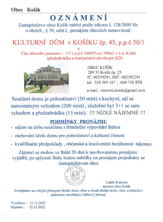 Součástí domu je pohostinství s kuchyní, sál se samostatným vchodem, služební byt a předzahrádka