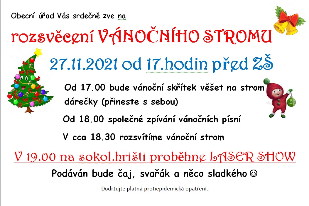 Obecní úřad Vás srdečně zve na rozsvěcení vánočního stromu a laser show v sobotu 27.11.2021 od 17.00 hodin před sokolovnou.