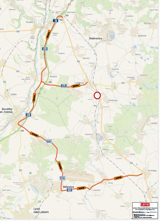 Pro vozidla ve směru Nymburk: po značené objízdné trase, křižovatka se silnicí č. I/38 a č. I/16 Bezděčín – silnice č. I/16 – silnice č. II/610 – Písková Lhota – Brodce/případně silnice č. I/38 –Luštěnice – silnice č. II/275 Brodce – silnice č. II/610 – Benátky nad Jizerou – okružní křižovatka – silnice č. II/272 – silnice č. III/27212 – nezařazený úsek komunikace bývalý VVP Milovice, délka cca 300 metrů – silnice č. III/3321 – Milovice – silnice č. II/332 – Zbožíčko – Straky – Krchleby – silnice č. I/38, délka cca 32 km