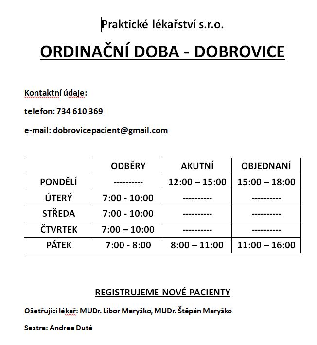 Od 17.02.2025 budou v ordinacích praktického lékaře pro dospělé (MUDr. Maryško) - Semčice a Dobrovice - pozměněny ordinační hodiny.