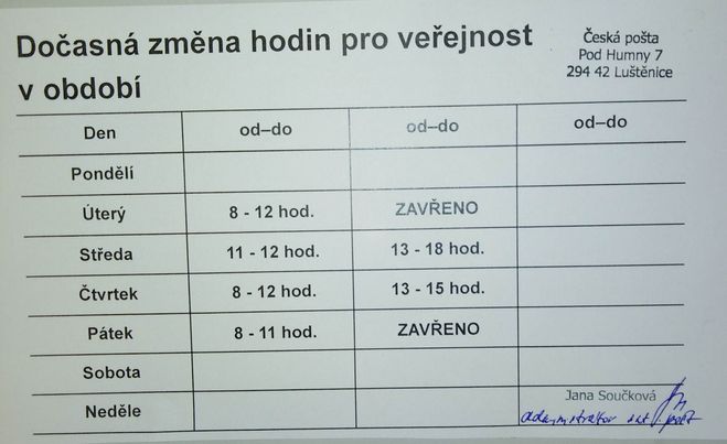 úterý 8.00 - 12.00 středa 11.00 - 12.00 a 13.00 - 18.00 čtvrtek 8.00 - 12.00 a 13.00 - 15.00 pátek 8.00 - 11.00