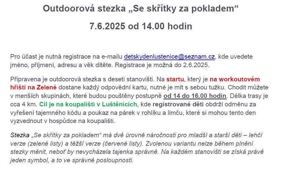 Nutná registrace dětí na destkydenlustenice@seznam.cz